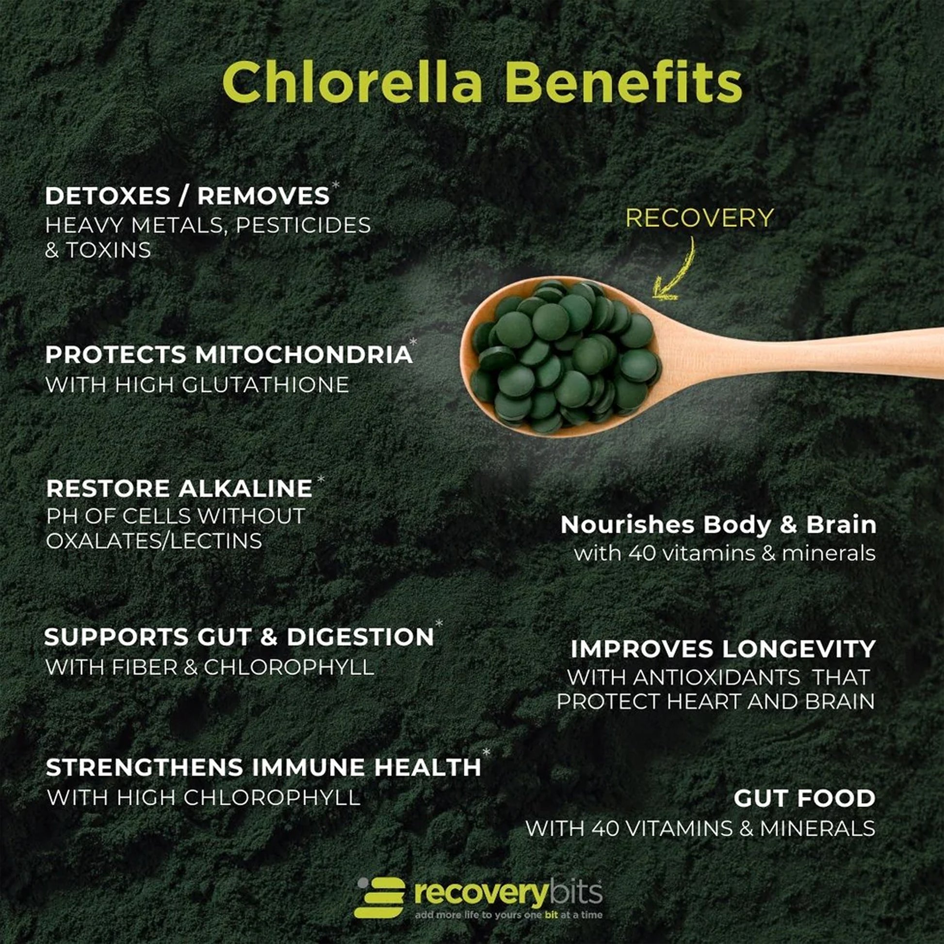 Product Description: Boost your wellness with RECOVERYbits® Chlorella, a USDA-certified organic superfood packed with pure, non-GMO chlorella algae. Each tablet delivers a nutrient-dense punch with over 40 vitamins, minerals, and the highest chlorophyll content of any food—1,000x more than greens! Support your body’s natural detox, strengthen immunity, and promote radiant skin and gut health. Perfect for post-workout recovery, cleansing, or replacing daily greens, these cracked-cell-wall chlorella tablets are a clean, plant-based solution with just one calorie per tablet. Take 10–30 tablets daily, before bed, or during a detox for optimal results. No fillers, additives, or cooking required—pure nutrition for a revitalized you.